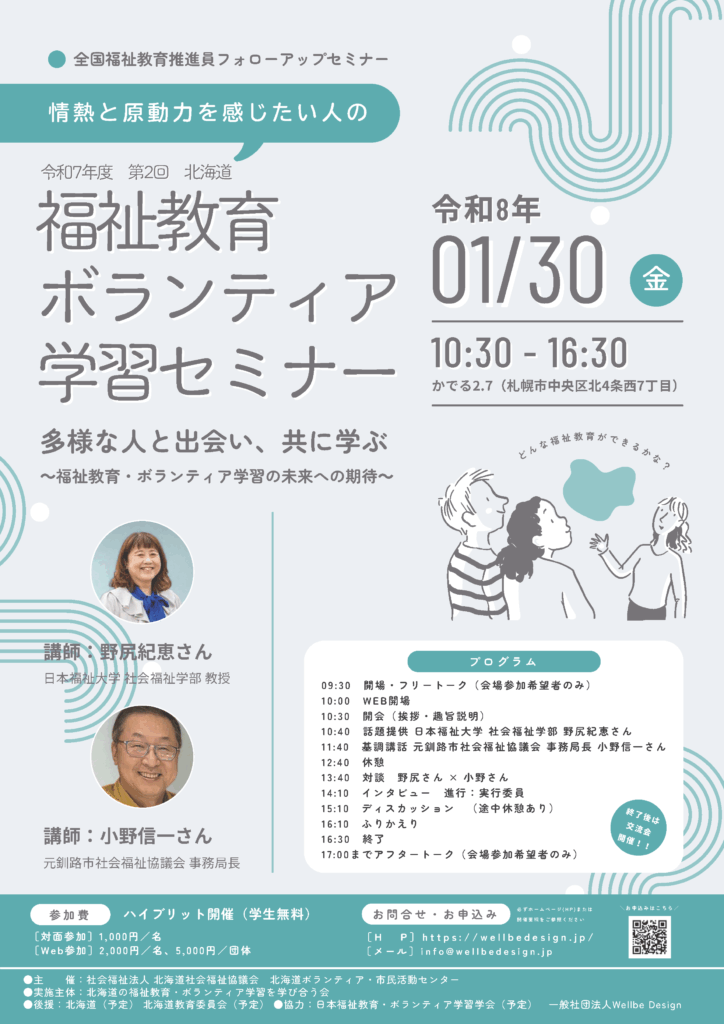 | ➣ 参加申込・参加費に関するお問合せ先 北海道の福祉教育・ボランティア学習を学び合う会 事務局 〒004-0022札幌市厚別区厚別南2丁目7番28号 一般社団法人Wellbe Design内 TEL:011-801-7450 FAX:011-801-7451 E-mail:info@wellbedesign.jp URL:https://wellbedesign.jp |